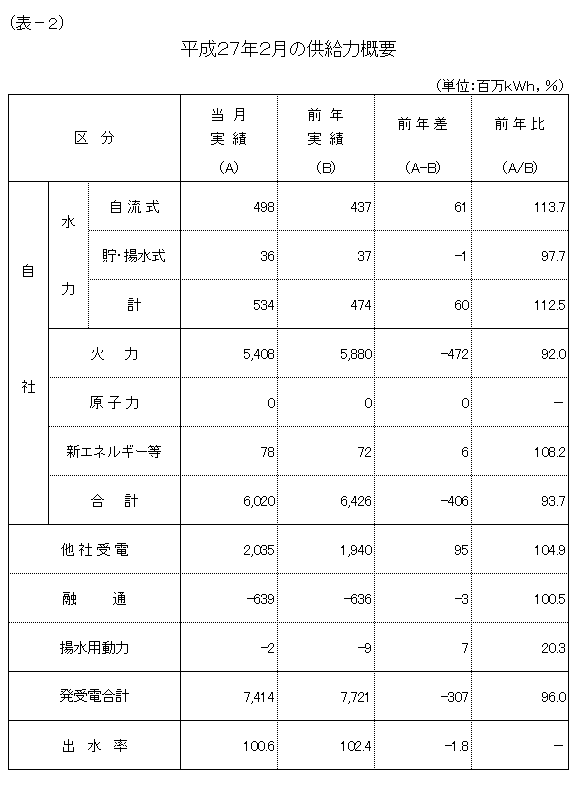 2月の発受電電力量の合計は、74億1,400万kWh、対前年比96.0%の実績となり、2カ月連続で前年実績を下回りました。