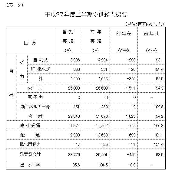 平成27年度上半期の発受電電力量の合計は、387億7,600万kWh、対前年比98.9%の実績となり、前年実績を下回りました。