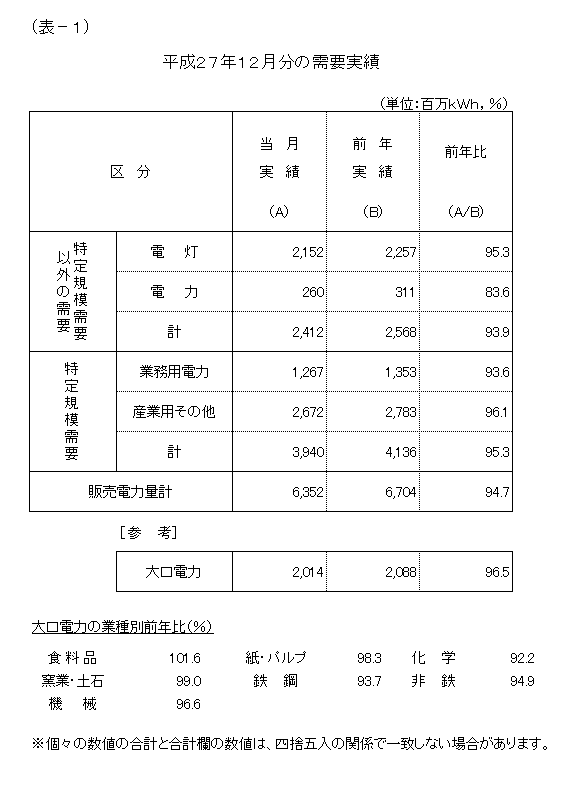 12月分の販売電力量は、63億5,200万kWh、対前年比94.7%の実績となりました。東日本大震災からの復興の動きなどが続いていることに加え、前年に比べ検針期間が長かったものの、気温が高めに推移したことによる暖房需要の減少や節電への取り組みなどから、前年同月実績を下回りました。