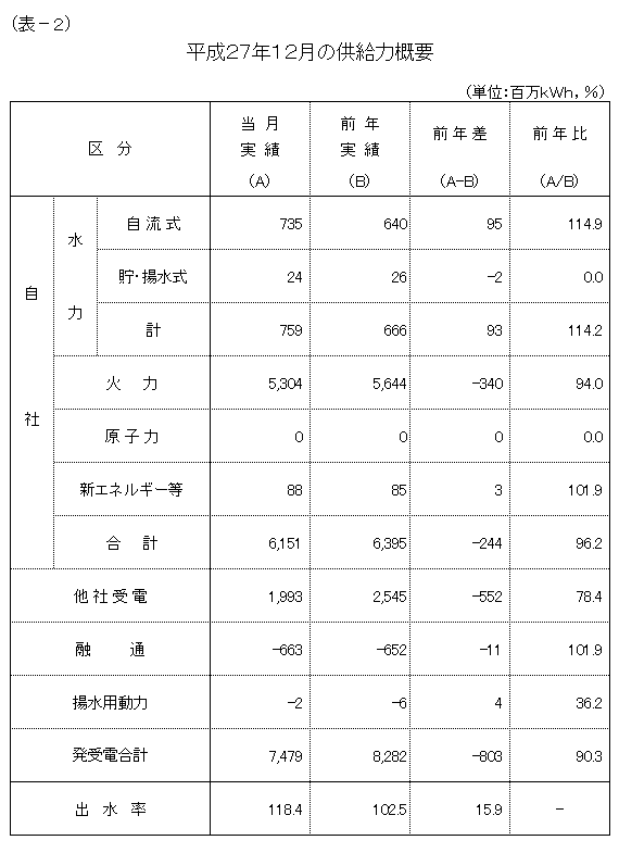 12月の発受電電力量の合計は、74億7,900万kWh、対前年比90.3%の実績となり、5カ月連続で前年実績を下回りました。