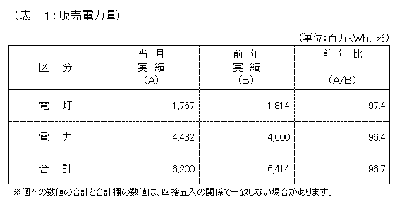 8月分の販売電力量の合計は、62億kWh、対前年比96.7%の実績となり、前年に比べ検針期間が長かったものの、7月中旬から8月上旬にかけて前年よりも気温が低く推移したことによる冷房需要の減少や契約電力の減少などから、前年実績を下回りました。