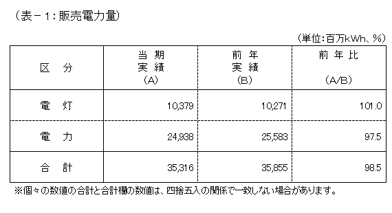 電灯は、前年に比べ検針期間が長かったことや、夏場後半以降の気温が高く推移したことによる冷房需要の増加などから、対前年比101.0%と前年実績を上回りました。