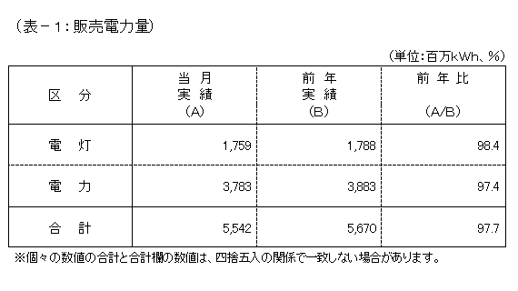 電灯は、前年に比べ4月下旬の気温が低かったことによる暖房需要の増加があるものの、契約口数の減少などから、対前年比98.4%と前年実績を下回りました。