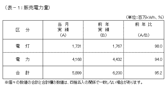 8月分の販売電力量の合計は、58億9,900万kWh、対前年比95.2%となり、契約電力の減少や前年に比べ気温が低かったことによる冷房需要の減少などから、前年実績を下回りました。