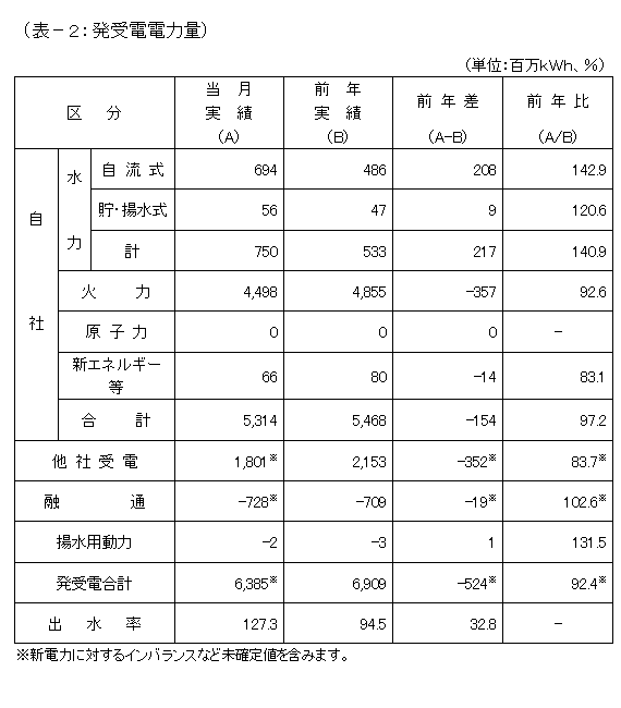 8月の発受電電力量の合計は、63億8,500万kWh、対前年比92.4%の実績となり、前年実績を下回りました。