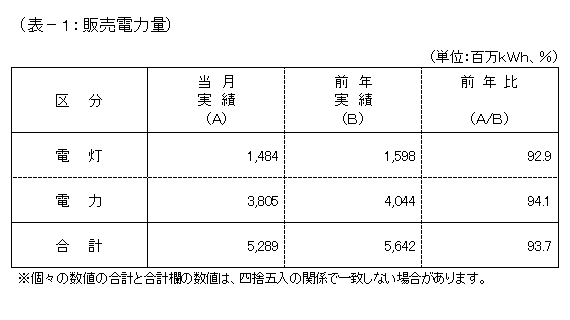 10月分の販売電力量の合計は、52億8,900万kWh、対前年比93.7%となり、前年に比べ検針期間が短かったことや契約電力の減少などから、前年実績を下回りました。