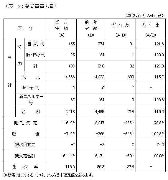 他社発電所の運転状況の違いなどから、他社受電合計では、前年を4億3,500万kWh下回る16億1,200万kWhとなりました。