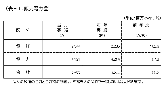 12月分の販売電力量の合計は、64億6,500万kWh、対前年比99.5%となり、前年に比べ気温が低かったことによる暖房需要の増加があるものの、契約電力の減少などから、前年実績を下回りました。