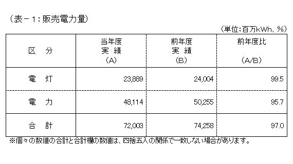 電力は、前年に比べ冬場の気温が低かったことによる暖房需要の増加があるものの、契約電力の減少や夏場後半の気温が低かったことによる冷房需要の減少などから、対前年度比95.7%と前年度実績を下回りました。