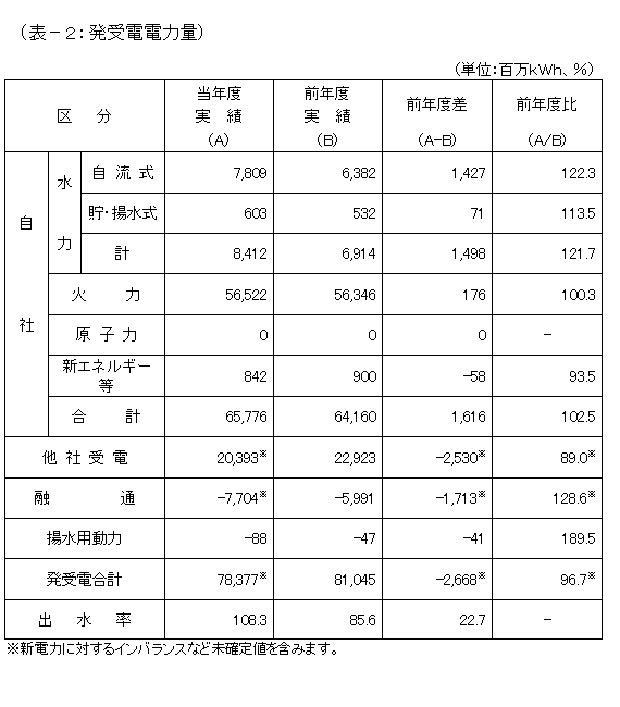 出水率108.3%の豊水となり、前年出水率を22.7%上回ったことなどから、発電量は前年を14億9,800万kWh上回る84億1,200万kWhとなりました。