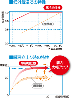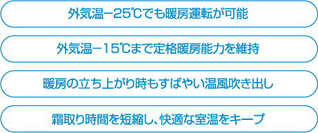 寒冷地仕様のヒートポンプ空調システムでは、外気温-25℃でも運転が可能なため、北国での使用も十分満足いただけます。また、-15℃まで定格暖房能力を維持するため、機器台数を最小限に計画することが可能です。さらに、暖房立ち上がりも早い等、暖房性能が大幅に向上しているため、一年を通して室内を快適な環境に保つことができます。