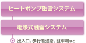 空気や水などが持つ熱を有効利用する、環境にやさしく経済的なシステムです。ヒートポンプユニットで温めた熱媒が、地面に埋設した融雪パイプを循環して路面を温めます。