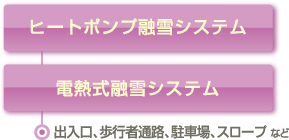 【ヒートポンプ】 空気や水などが持つ熱を有効利用する、環境にやさしく経済的なシステムです。ヒートポンプユニットで温めた熱媒が、地面に埋設した融雪パイプを循環して路面を温めます。