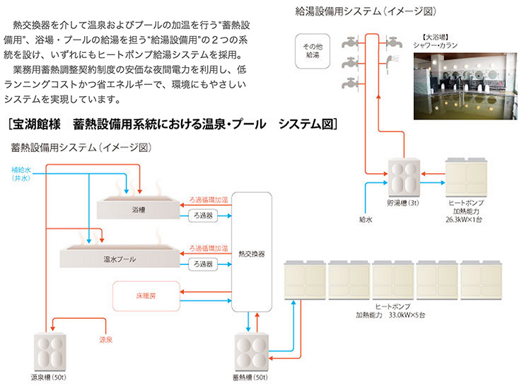 1つは蓄熱設備用のヒートポンプ給湯システムです。これは、温水を貯湯槽(蓄熱槽)に貯え、熱交換器を介して浴槽およびプールの加温、冬期の床暖房用として利用しています。もう1つは給湯設備用のヒートポンプ給湯システムです。こちらは浴槽のカラン・シャワー、プールのシャワー、トイレなどの消費場所に配湯しています。