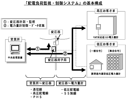 平成13年6月20日 当社はこのたび、変圧器、電力量計などの配電機器の使用状況を、遠隔で自動管理(監視、制御、計測等)することにより、 設備投資抑制と業務効率化を図る「配電負荷監視・制御システム」(以下、「開発システム」といいます。)を開発し、 今年度より一部営業所に導入、実運用における効果の検証を開始することといたしました。 当社供給エリア内には、約100万台の変圧器が設置されており、個々の変圧器については、 その変圧器から供給されているお客さまの電気の契約容量や使用量をもとに必要となる容量を計算しております。 また、お客さまの新増設の都度再計算し、変圧器の容量が不足する場合など、必要に応じて取替工事を行っております。 電力量計については、一般の低圧お客さま用として約600万台設置されておりますが、お客さまの引越し等がある場合、 現地で電気の入り切り作業を行っております。 今回開発したシステムは、当社の営業所に設置した中央処理装置から、当社の保有するネットワークを介し、 遠隔で変圧器の計測・監視や低圧電力量計での電気の入り切りなどを可能としました。 この結果、実測値にもとづく電気の使用実態に合ったより一層効率的な変圧器の使用や、 これに伴う取替工事の減少といった設備投資の抑制が図られるとともに、 電気の入り切り作業を営業所からの遠隔操作で実施することによる業務の効率化などが期待できます。 この開発システムで使用するネットワークには、既存の当社の配電自動化システムネットワーク(通信線、高圧配電線) や低圧配電線を用いることで、新たな通信設備の建設コストを不要としました。 また、状況に応じてPHSやSS無線などによる対応も可能としており、既存のネットワークに対する柔軟な対応を実現しました。 開発システムの基本構成は別添「参考」のとおりであり、研究・開発にあたっては平成7年度より、システム構成・伝送技術の検討、 各種機器開発、伝送信頼度の確認、さらに実用化に向けた検証といったステップで進めてまいりました。 今回の効果検証の期間は、本年7月から平成14年3月までの9カ月間を予定しており、一部地域で開発システムによる実際の業務運用を行い、 変圧器取替工事の抑制効果、現地作業の回避による効率化効果等を実運用ベースで算定することとしております。 なお、開発システムにおいて、今回新たに開発・実用化した主な機器の特徴は、以下のとおりです。