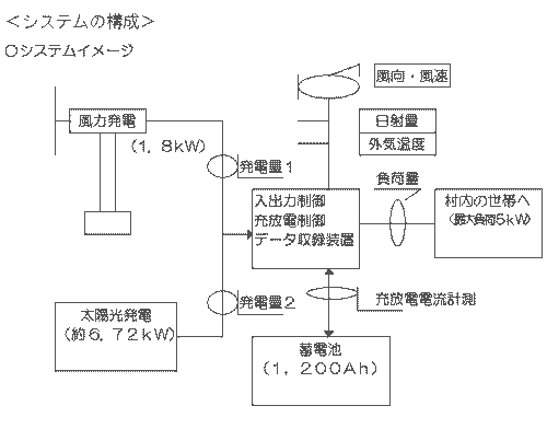気象観測:風向・風速、日射量、外気温度電力計測:風力発電出力、太陽光発電出力、 負荷出力、充放電電流計測