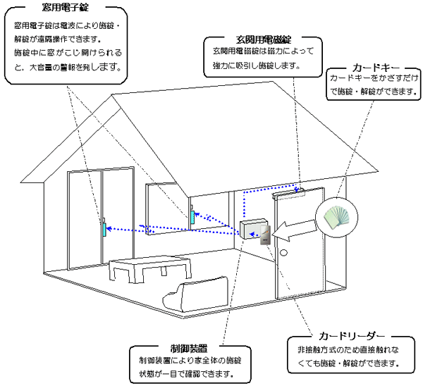 「住宅用集中ロックシステム」とは,車のワイヤレス集中ロックのように玄関と複数の窓を一斉に施錠する「集中ロック装置」と,不法な侵入者に対して大音量で威嚇する「警報装置」により構成される製品です。