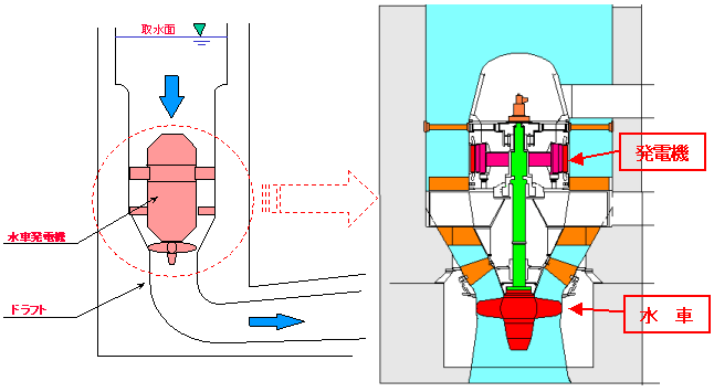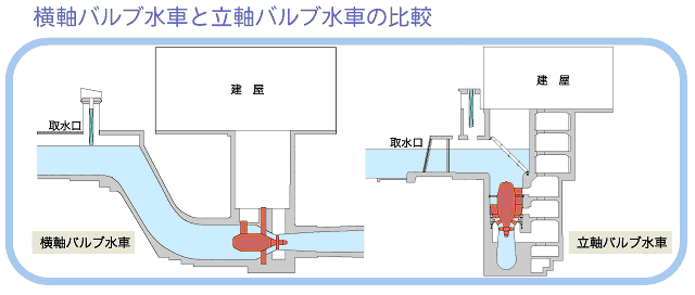 従来,バルブ水車は,水車と発電機を水平に配置した横軸タイプでありましたが,これを垂直に配置したものが立軸バルブ水車です。