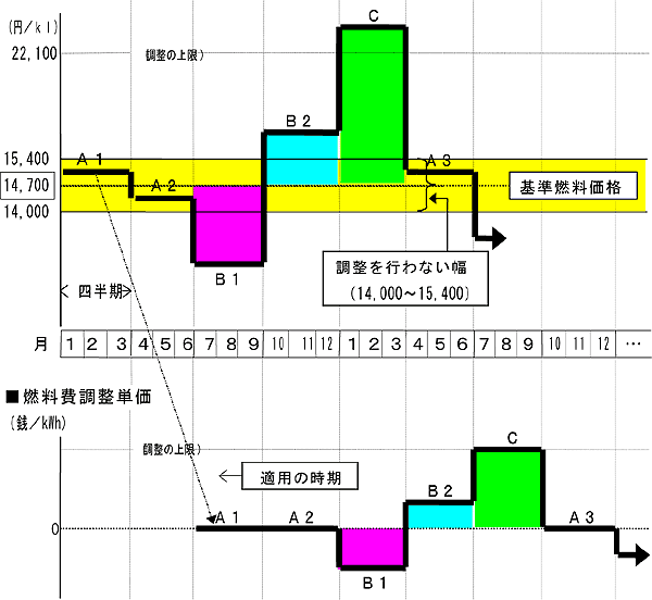 具体的な調整は、通関統計による四半期毎の平均燃料価格と料金改定時織込みの基準燃料価格との変動幅に応じて四半期毎に行うもので、料金の小幅かつ頻繁な変動を避けるため、その変動幅が基準燃料価格の±5%の範囲内であれば調整を行わないこととし、また、燃料価格の大幅な上昇によるお客さまへの影響を緩和するため、料金の調整幅には基準燃料価格の50%という上限を設定しております。