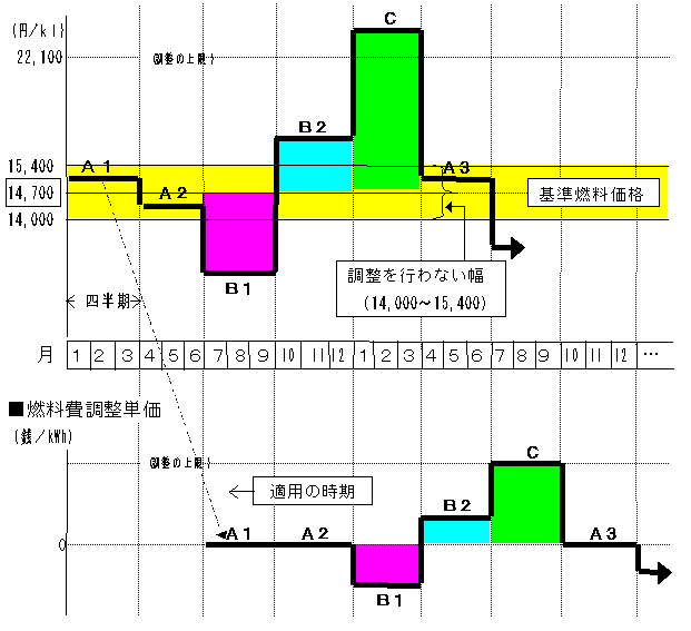 7〜9月分の平均燃料価格は、燃料費調整を行わない範囲内(14,000円/kl以上15,400円/kl以下)となりましたので、平成15年1〜3月分の電気料金につきましては燃料費調整を行いません。