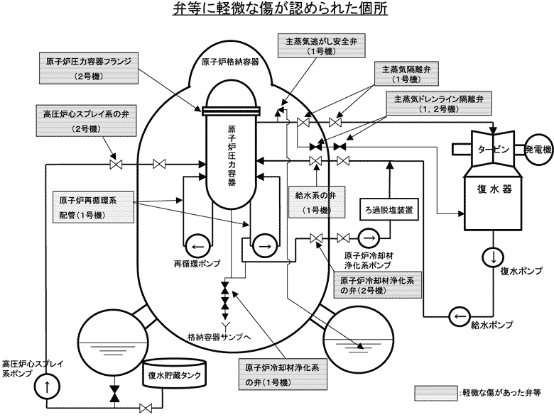 | 弁 | 主蒸気ドレンライン隔離弁の弁座、弁体肉盛部に、軽微な傷があり、手入れ後の浸透探傷試験で欠陥は認められず、使用上問題ないことを確認していた。 | |