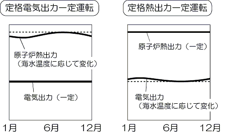 「定格熱出力一定運転」とは、原子炉から発生する熱量(原子炉熱出力)を原子炉設置許可申請で認められた最大の熱出力に保ったまま運転することです。定格熱出力一定運転を行った場合、電気出力は下の図のように海水温度に応じて変化します。