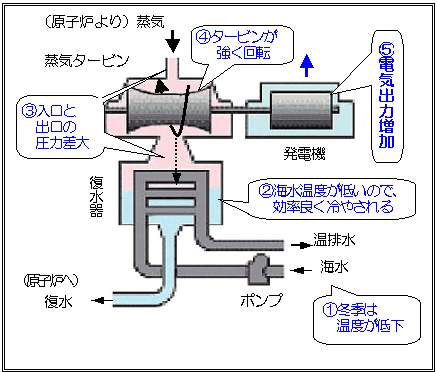 原子炉が一定に運転された場合、蒸気発生量が同じでも冬季に海水温度が低下すると、蒸気はより低い温度で効率良く冷やされます。それによって、蒸気タービンの入口と出口の圧力の差が大きくなりますので、蒸気タービンがより強く回転し、多くの電気出力を得ることができます。