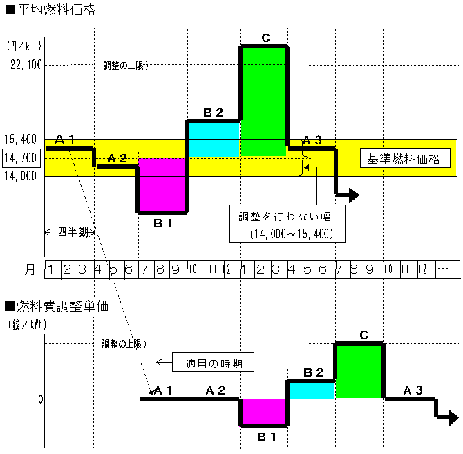 具体的な調整は、通関統計による四半期毎の平均燃料価格と料金改定時織込みの基準燃料価格との変動幅に応じて四半期毎に行うもので、料金の小幅かつ頻繁な変動を避けるため、その変動幅が基準燃料価格の±5%の範囲内であれば調整を行わないこととし、また、燃料価格の大幅な上昇によるお客さまへの影響を緩和するため、料金の調整幅には基準燃料価格の50%という上限を設定しております。