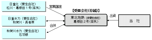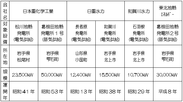 平成15年3月27日 当社は、本日、日本重化学工業(株)(以下「日重化」という)、日重化グループの日重水力(株)、和賀川水力(株)(3社とも 管財人 多比羅 誠氏)、ならびに東北地熱エネルギー(株)(以下「東北地熱」という)との間で、日重化グループエネルギー部門の事業再建に関わる基本合意書を締結しました。 現在、日重化グループは会社更生法を申請し経営再建中ですが、同社グループのエネルギー事業を、営業譲渡や合併により東北地熱に集約して再建するとともに、当社が、東北地熱の増資新株式を引き受け経営主体として参画することについて、基本的な合意に至ったものです。 具体的には、現在、日重化が行っている事業のうち、当社葛根田地熱発電所1号機への地熱蒸気供給事業、松川地熱発電所における電気供給事業については、営業譲渡により東北地熱が承継します。また、日重水力(株)および和賀川水力(株)が長者原(発)、和賀川(発)および石羽根(発)で行っている水力発電による電気供給事業については、吸収合併により東北地熱が承継します。なお、当社葛根田地熱発電所2号機への地熱蒸気供給事業は東北地熱が行っています。 当社は、これまで、日重化のエネルギー部門の設備が東北地域にあること、現在でも同社から電気、蒸気を購入していること、葛根田地熱発電所は当社と日重化グループとの共同プラントであることなどを踏まえ、支援について前向きに検討してきましたが、電気や蒸気購入の面でのコストメリットが期待できることなどから、経営主体として事業再建に参画することといたしました。 これにより、当社は、東北地熱を通じて、これまで日重化グループが東北地域で展開してきた地熱・水力発電事業を承継することとなり、クリーンな国産エネルギーの供給を通じ、地域に貢献できればと考えています。 今後、営業譲渡および合併に向けて詳細を協議し、日重化グループの会社更生計画認可決定の確定を前提に、10月上旬を目途に営業譲渡および合併等を実行することとしています。 以 上 <参考資料> 1.日重化グループエネルギー部門 関連会社の概要