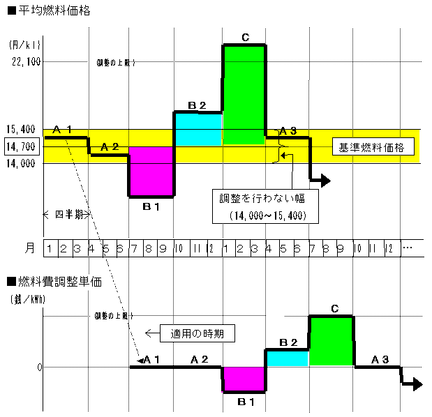 具体的な調整は、通関統計による四半期毎の平均燃料価格と料金改定時織込みの基準燃料価格との変動幅に応じて四半期毎に行うもので、料金の小幅かつ頻繁な変動を避けるため、その変動幅が基準燃料価格の±5%の範囲内であれば調整を行わないこととし、また、燃料価格の大幅な上昇によるお客さまへの影響を緩和するため、料金の調整幅には基準燃料価格の50%という上限を設定しております。