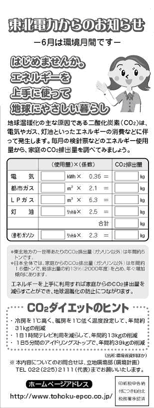 お客さまが地球環境問題に関心を持ち、CO2排出削減やエネルギーの有効利用に取り組んでいただくきっかけとして、お客さまがご家庭で使用するエネルギー源の使用量からCO2排出量を求める計算方法やCO2削減のための行動ヒントを、6月分の検針票裏面に掲載する。 |