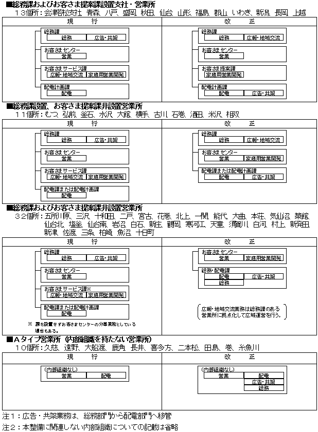 その他の営業所(Aタイプ営業所を除く32個所)については総務課を廃止するとともに、総務業務は配電課、または配電計画課に移管し、「総務・配電課」とする。