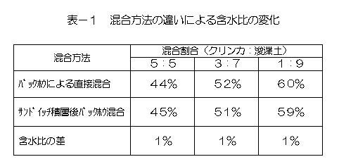 クリンカアッシュと不良土を直接混合する方法とサンドイッチ状にした後に混合する方法で試験を実施。混合方法の違いにより、含水比に大きな変化がなかったことから直接混合する方法を選定。