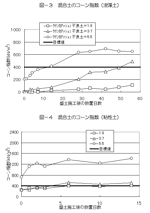 クリンカアッシュを5割まで使用したものが、道路盛土材として利用可能な目標値に短期間で到達している。 |