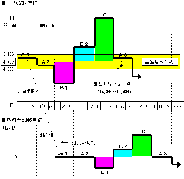 具体的な調整は、通関統計による四半期毎の平均燃料価格と料金改定時織込みの基準燃料価格との変動幅に応じて四半期毎に行うもので、料金の小幅かつ頻繁な変動を避けるため、その変動幅が基準燃料価格の±5%の範囲内であれば調整を行わないこととし、また、燃料価格の大幅な上昇によるお客さまへの影響を緩和するため、料金の調整幅には基準燃料価格の50%という上限を設定しております。