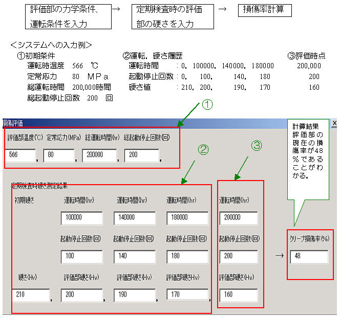 運転時間や起動回数等の運転条件、評価する部品がおかれている温度や応力等の力学条件、定期点検における部品の硬さの経年化データを入力することで、複雑な計算を要する部材の劣化評価を短時間で容易に行えるシステム。評価にあたっては、高温条件下で経年化すると高温変形により熱応力が徐々に緩和されるという特性を考慮している。
