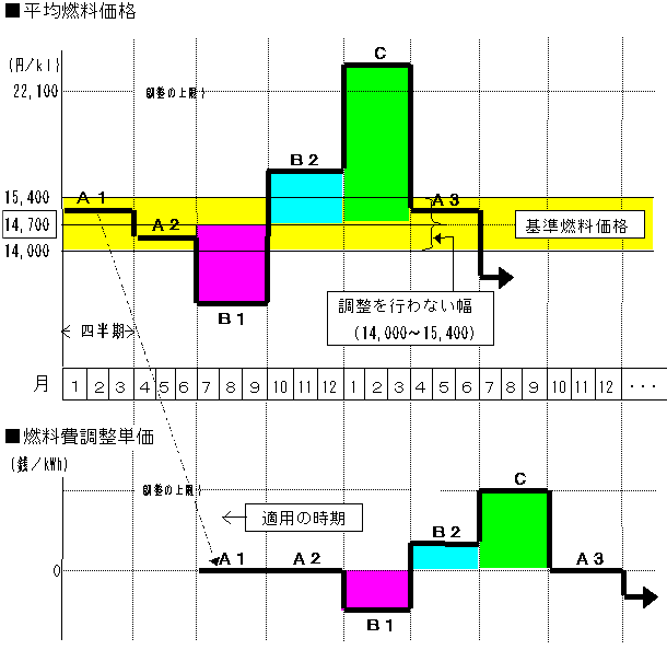 具体的な調整は、通関統計による四半期毎の平均燃料価格と料金改定時織込みの基準燃料価格との変動幅に応じて四半期毎に行うもので、料金の小幅かつ頻繁な変動を避けるため、その変動幅が基準燃料価格の±5%の範囲内であれば調整を行わないこととし、また、燃料価格の大幅な上昇によるお客さまへの影響を緩和するため、料金の調整幅には基準燃料価格の50%という上限を設定しております。