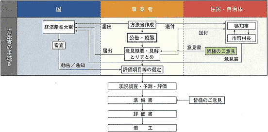 今後、皆様のご意見をお聞きした上で調査・予測・評価を行い、その結果を「準備書」としてとりまとめ、縦覧することとなります。 |