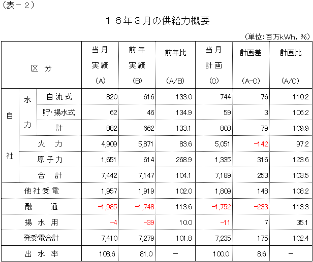 3月の発受電電力量の合計は、74億1,000万kWhとなり、計画比102.4%、前年比101.8%の実績となりました。