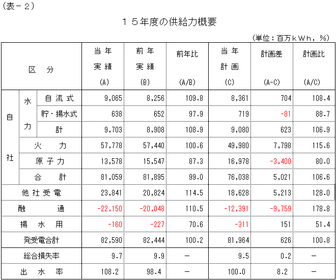 15年度の発受電電力量の合計は、825億9,000万kWhとなり、計画比で100.8%、前年比では100.2%の実績となりました。