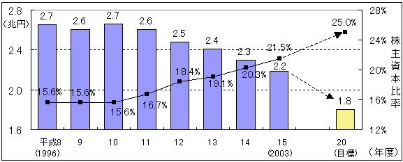 当社は、企業価値向上をはかるため、厳しい競争環境下においてもEVA®を継続的に創出するROAレベルを達成し、資本コスト削減に資する有利子負債削減の推進と資産スリム化の徹底をはかり、財務体質を改善してまいります。