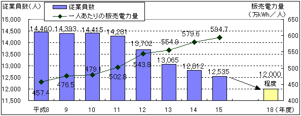 従業員数は、平成15年度計画(17年度末までに12,300名)からさらに300名程度削減し、12,000名程度まで抑制してまいります。