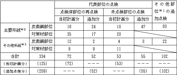 平成16年8月9日に発生した関西電力美浜原子力発電所3号機2次系配管破損事故に鑑み、当初計画していた点検に加え、代表部位における炭素鋼の未点検部位の前倒し点検を実施するとともにその他部位の追加点検を実施しました。(表−1)