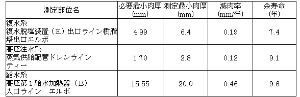 表−2 配管肉厚測定結果例(余寿命の短い部位3箇所)